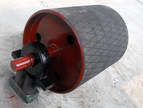 傳動滾筒是輸送機(jī)傳遞動力的部件。其驅(qū)動帶式輸送機(jī)的方式有單滾筒、雙滾筒及多滾筒之分。單滾筒多用于功率不太大的輸送機(jī)上,如煤礦地面運(yùn)輸及選煤廠等處。井下帶式輸送機(jī)一般均采用雙滾筒,以使輸送機(jī)結(jié)構(gòu)緊湊。傳動滾筒表面有裸露光鋼面,人字形和菱形花紋橡膠覆面。小功率、小帶寬及環(huán)境干燥時可采用裸露光鋼面。人字形花紋膠面摩擦系數(shù)大,防滑性和排水性好,但有方向性。菱形膠面用于雙向運(yùn)行的輸送機(jī)。